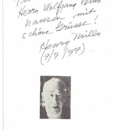 Miller, Henry (1891-1980 – amerikanischer Schriftsteller). Eigenhändige Widmung und Unterschrift auf postkartengroßem weißen Karton.