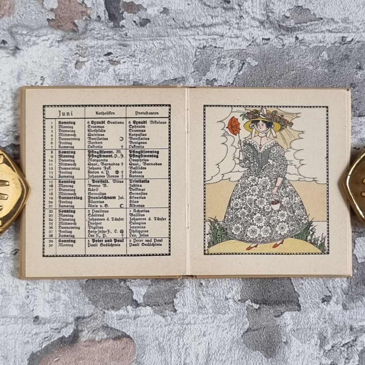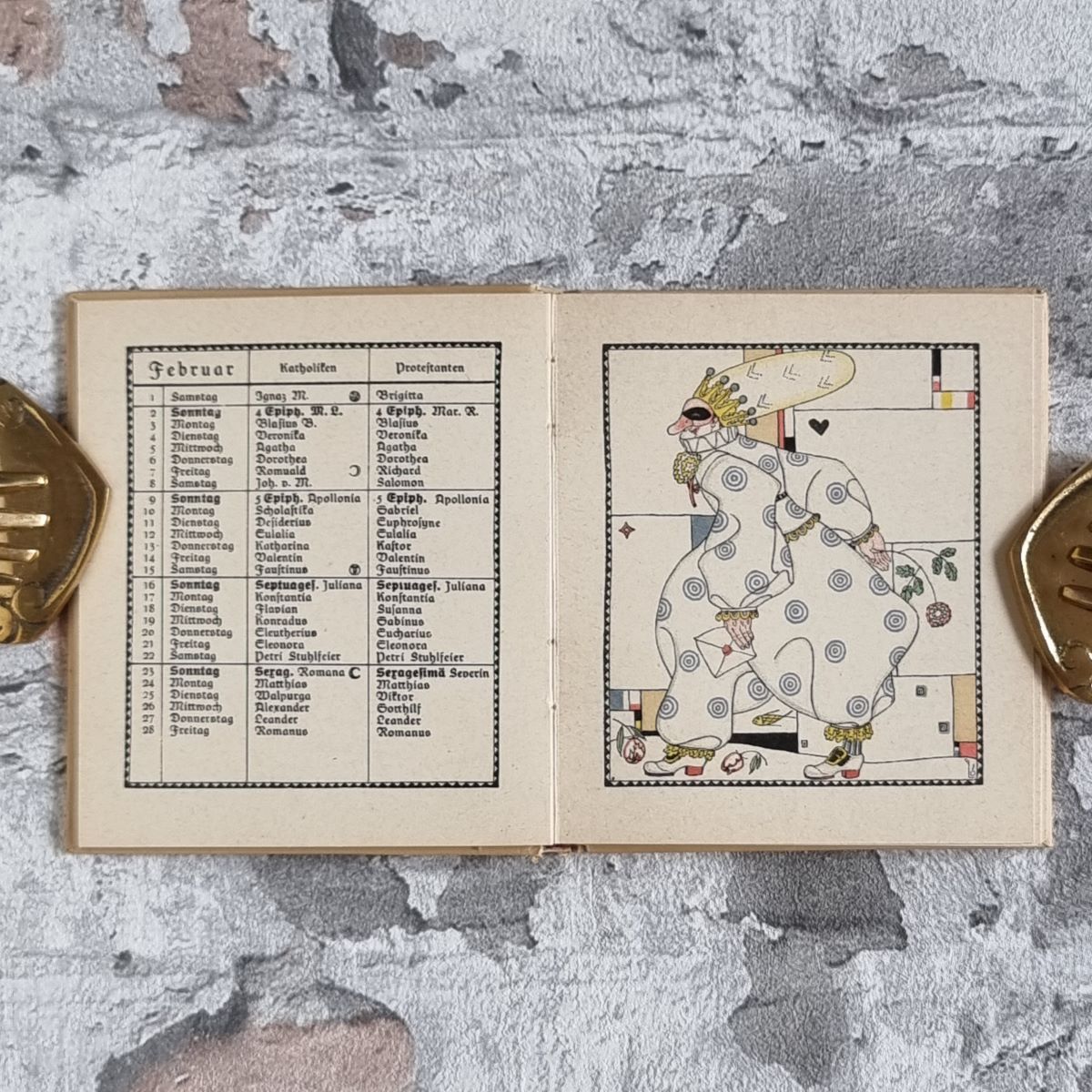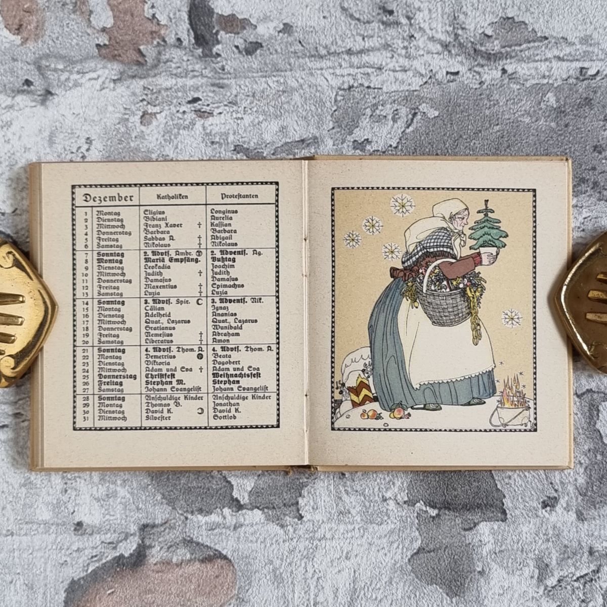 Wien, Kunstverlag Anton Schroll & Co., 1918. 12° (11 x 7 cm). (26) S. recto das Märchen, verso Kalendarium, (12) Bl. Tafeln mit farbigen Illustrationen. Farbig illustrierte Vorsätze. Original-Pappband mit Einbandillustration und kartonierter Original-Schuber.