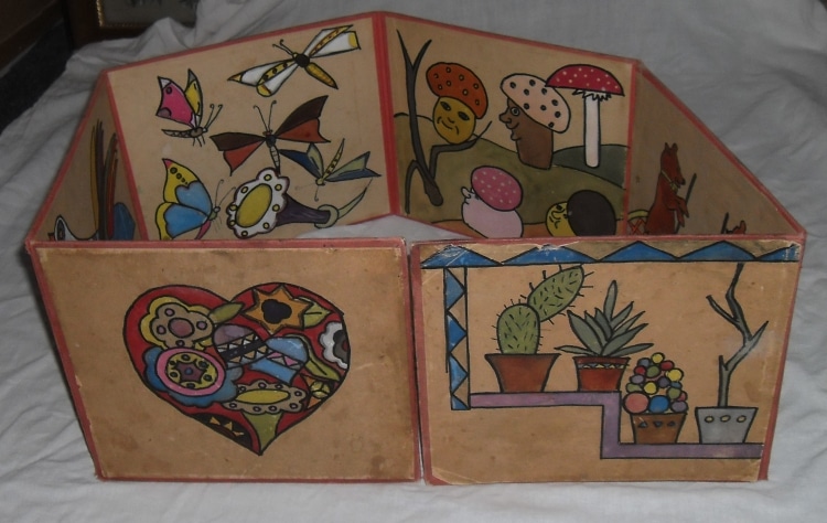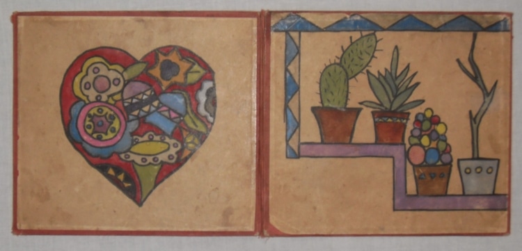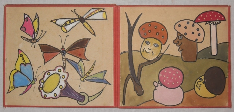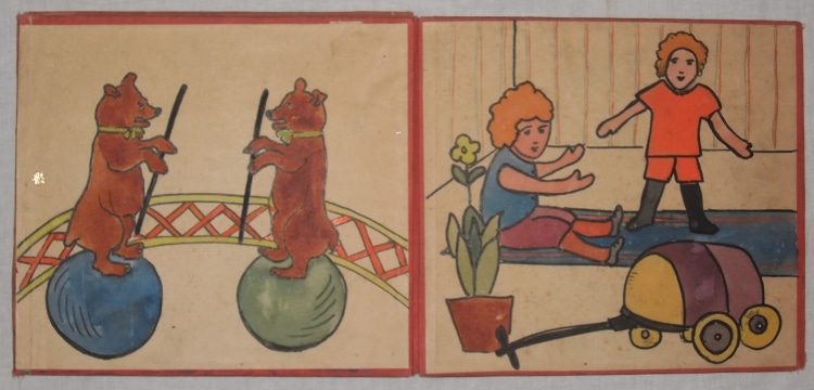 Kommentar/Zustand: Acht farbig ausgemalte Umrisszeichnungen. Kräftige Pappe, mit rotem Leinen eingefasst und zum Leporello verbunden. Farbbilder so montiert, daß, bis auf Titel- und Schlussbild, Rückseite frei bleibt. Die einzelnen Motive: Herz mit stilisierten Blumen / Zwei exotische Vögel / Truthenne mit bunt bemalten Eiern / Blüte mit fünf Schmetterlingen / Fünf Pilze (vier mit Gesichtern) auf einer Wiese / Zwei Tanzbären balancieren auf Bällen / Zwei spielende Kinder (Puppen?) / Vier Topfpflanzen auf einer Treppe (Blumenbank?). – Das Leporello dürfte wohl im Zeitraum 1910 bis 1930 entstanden sein. Eine nähere Zeitbestimmung ist mir bislang nicht möglich. – Das Papier ist beim Anfangs- und Schlußbild gedunkelt und etwas fleckig. Alles in allem gut erhaltenes Exemplar dieses Unikats.