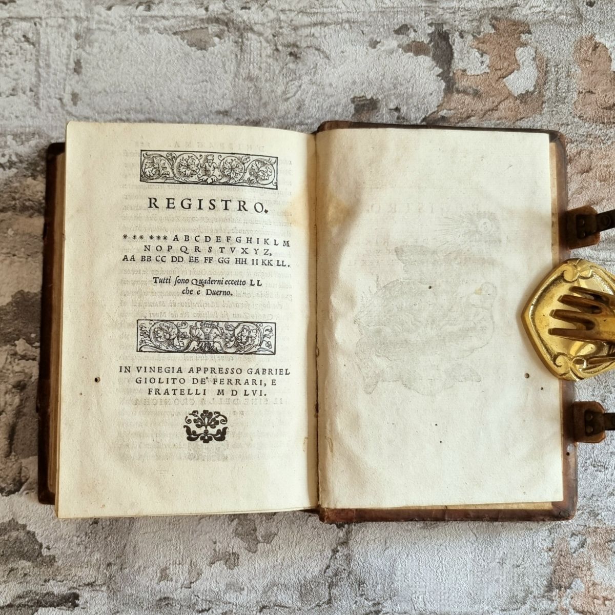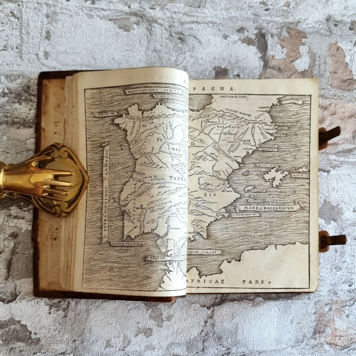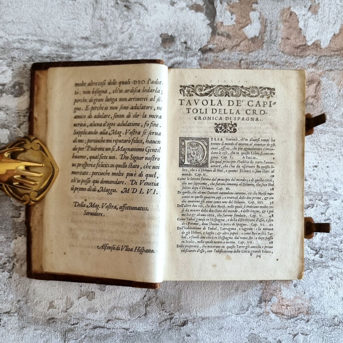 Vinegia (Venedig), Ferrari, 1556. Kl. 8° (16,5 x 11 cm). 36 Bl. (statt 38: Titelbl. fehlt, Kopie innenliegend), mit einer doppelblattgroßen Karte von Spanien, 533 S., 1 Bl., mit Druckermarke, sowie hübschen Initialen und Vignetten im Text. Lederband der Zeit auf 3 Bünden, geprägter Titel auf Vorderdeckel, Rollen- und Plattenstempel, Messingschließen.