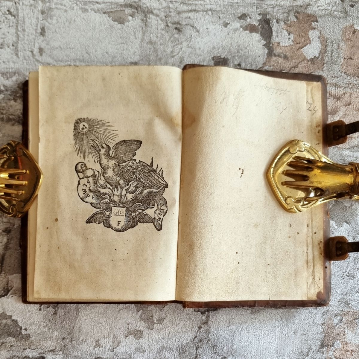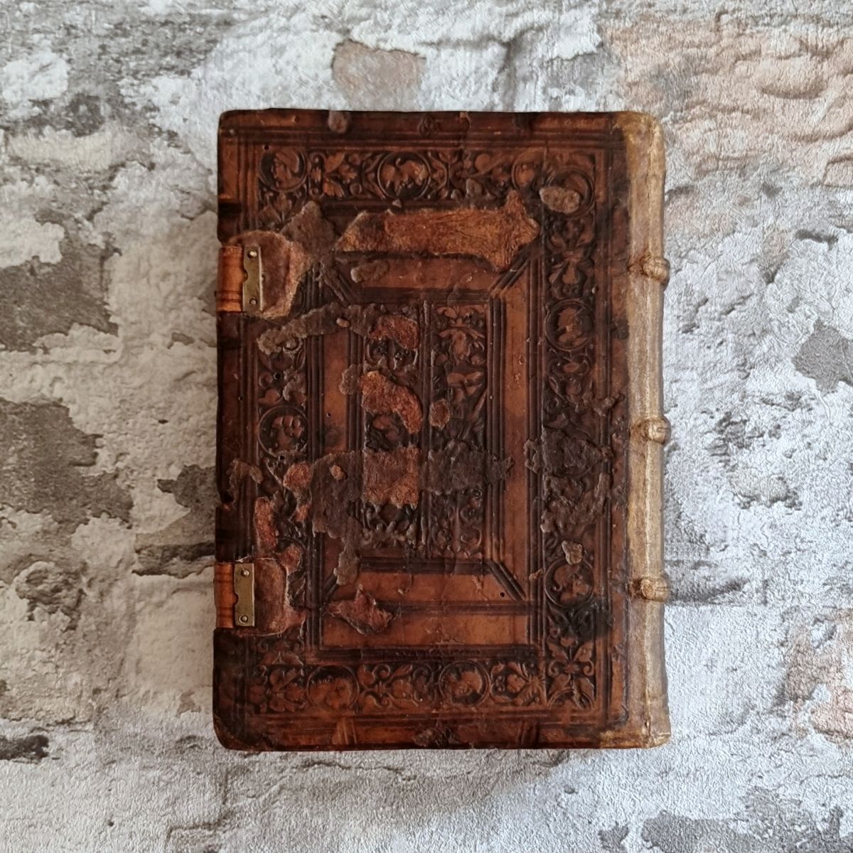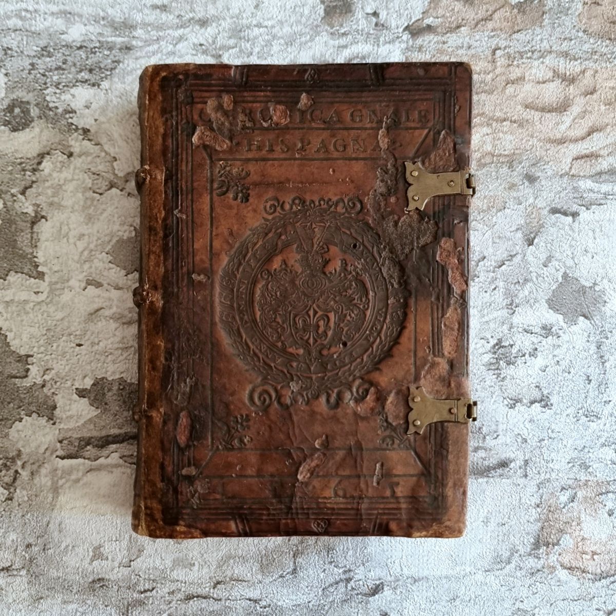 Vinegia (Venedig), Ferrari, 1556. Kl. 8° (16,5 x 11 cm). 36 Bl. (statt 38: Titelbl. fehlt, Kopie innenliegend), mit einer doppelblattgroßen Karte von Spanien, 533 S., 1 Bl., mit Druckermarke, sowie hübschen Initialen und Vignetten im Text. Lederband der Zeit auf 3 Bünden, geprägter Titel auf Vorderdeckel, Rollen- und Plattenstempel, Messingschließen.