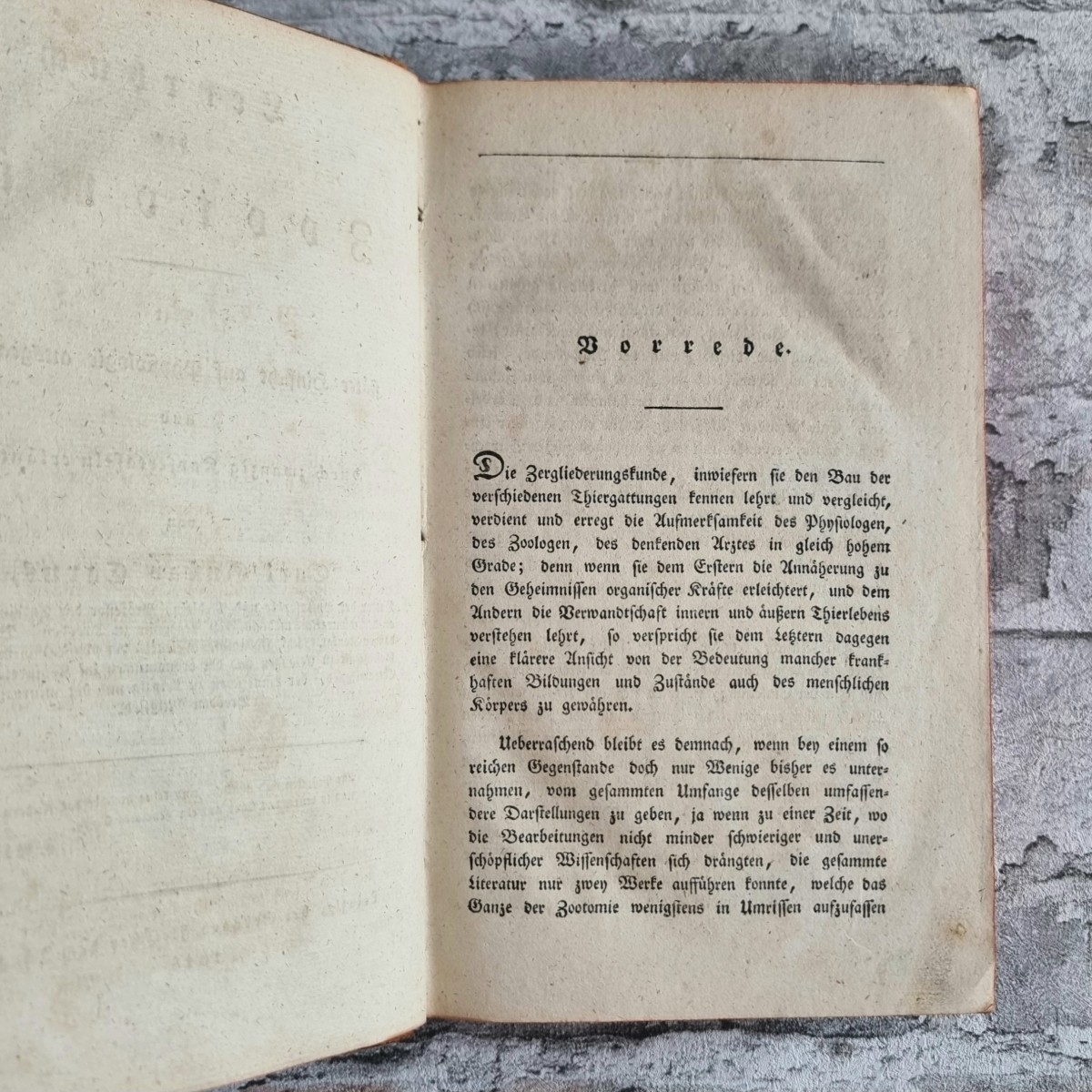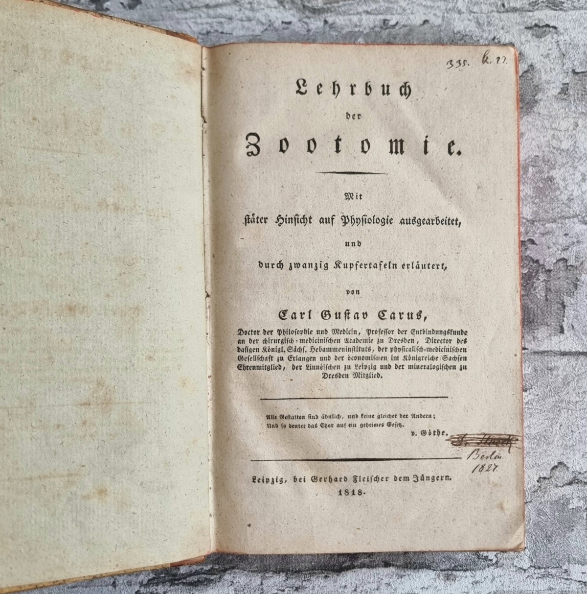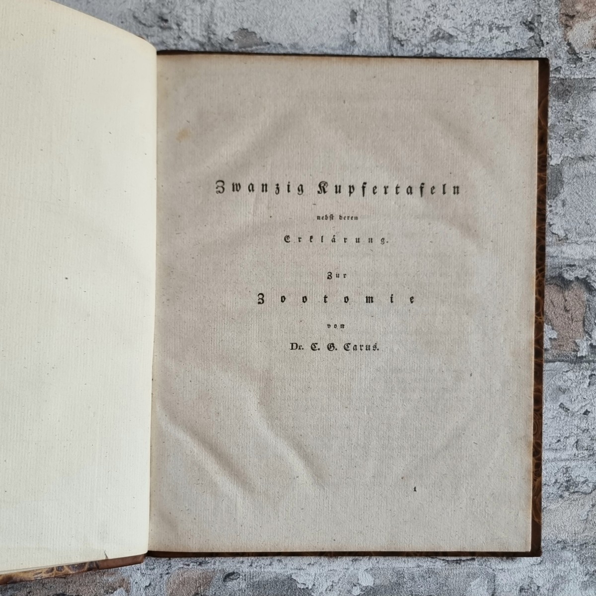 Kommentar/Zustand: Der Arzt, Naturforscher und Künstler Carl Gustav Carus (1789–1869) gestaltete mit dem Lehrbuch der Zootomie ein Standardwerk des frühen 19. Jahrhunderts. Es gilt als erste zusammenhängende Darstellung der tierischen Anatomie mit konsequenter Berücksichtigung physiologischer Fragestellungen. Die Kupfertafeln, teils nach der Natur gezeichnet, bieten einen reichen Anschauungsapparat und machten das Werk zugleich für Forschung und Lehre wertvoll. – Hauptband Ecken und Kanten leicht berieben. Handschriftliche Besitzervermerke auf fliegendem Vorsatz und Titelblatt. Vorsätze leicht stockfleckig. Auf Innenspiegel des Tafelbandes Exlibris „van der Hoeven“. Stellenweise etwas stockfleckig.