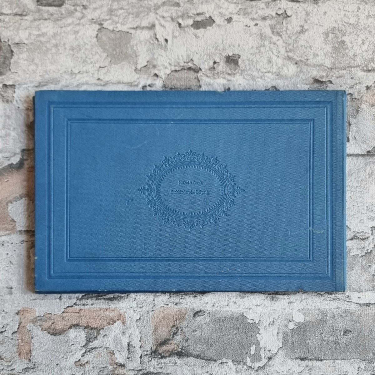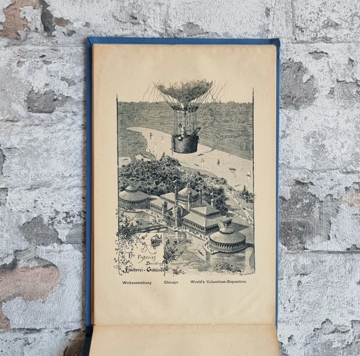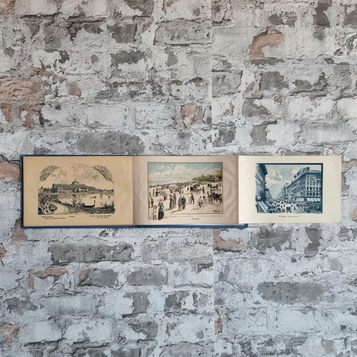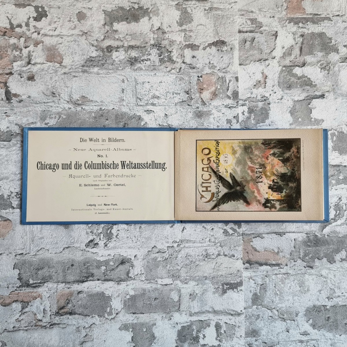Leipzig und New York, Internationalen Verlags- und Kunstanstalt (J. Laurencic), (1893/1894). Quer 8° (14,5 x 22 cm). (14) ganzseitig illustrierte Bl. mit Untertiteln als Leporello gebunden. Blauer Original-Ganzleinenband mit Deckelgestaltung und Titel vorne und geprägtem Buchbindersignet „Hübel & Denck – Buchbinderei Leipzig in blindgeprägter Rosette“ auf hinterem Deckel. Die Welt in Bildern. Neue Aquarell-Albums. No. 1.