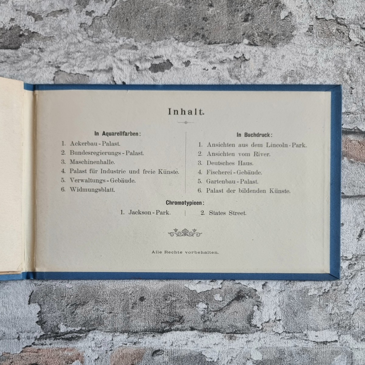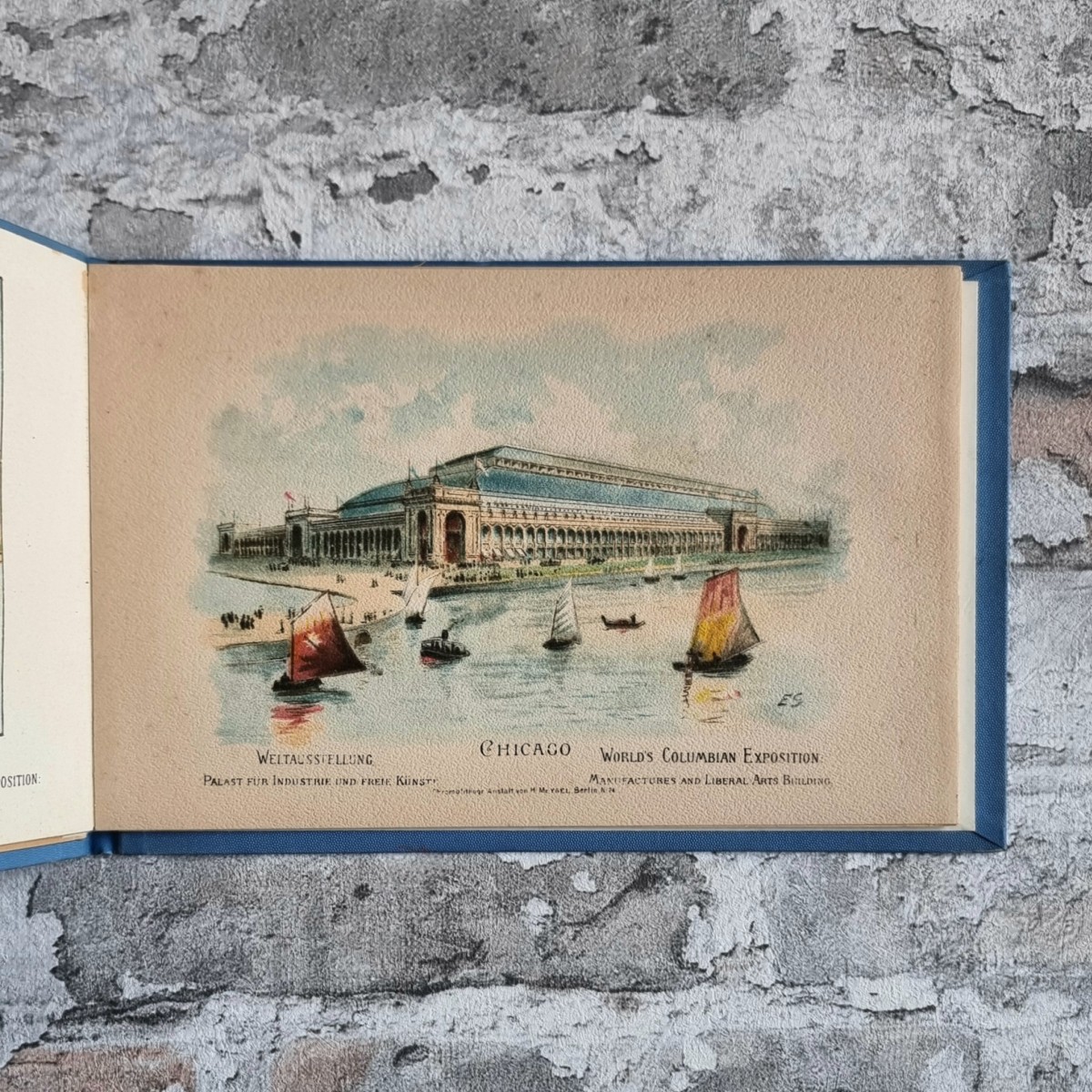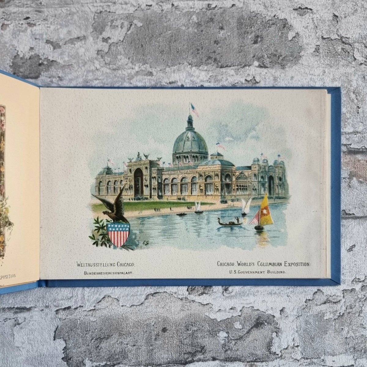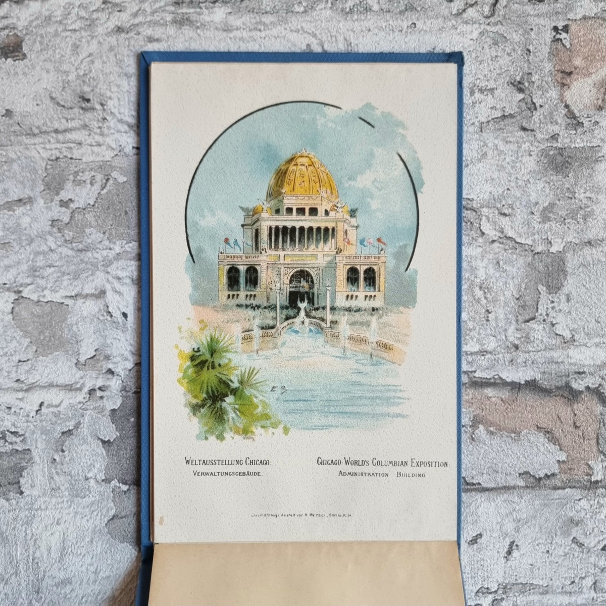 Kommentar/Zustand: Inhalt. In Aquarellfarben: 1. Ackerbau-Palast. * 2. Bundesregierungs-Palast. * 3. Maschinenhalle. * 4. Palast für Industrie und freie Künste. * 5. Verwaltungs-Gebäude. * 6. Widmungsblatt. * In Buchdruck. 1. Ansichten aus dem Lincoln-Park. 2. Ansichten vom River. * 3. Deutsches Haus. * 4. Fischerei-Gebäude. * 5. Gartenbau-Palast. * 6. Palast der bildenden Künste. * Chromotypieen. 1. Jackson-Park * 2. States Street. – Das vorliegende, sehr gut erhaltene Exemplar ist in den einschlägigen Katalogen des KVK nicht nachweisbar. Eine Ankündigung findet sich jedoch im Börsenblatt, Amtlicher Teil, Nr. 273 vom 24. November 1893, S. 7228.