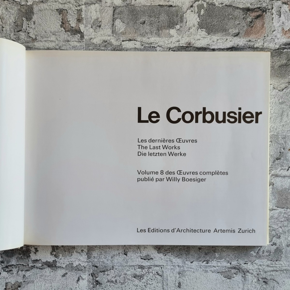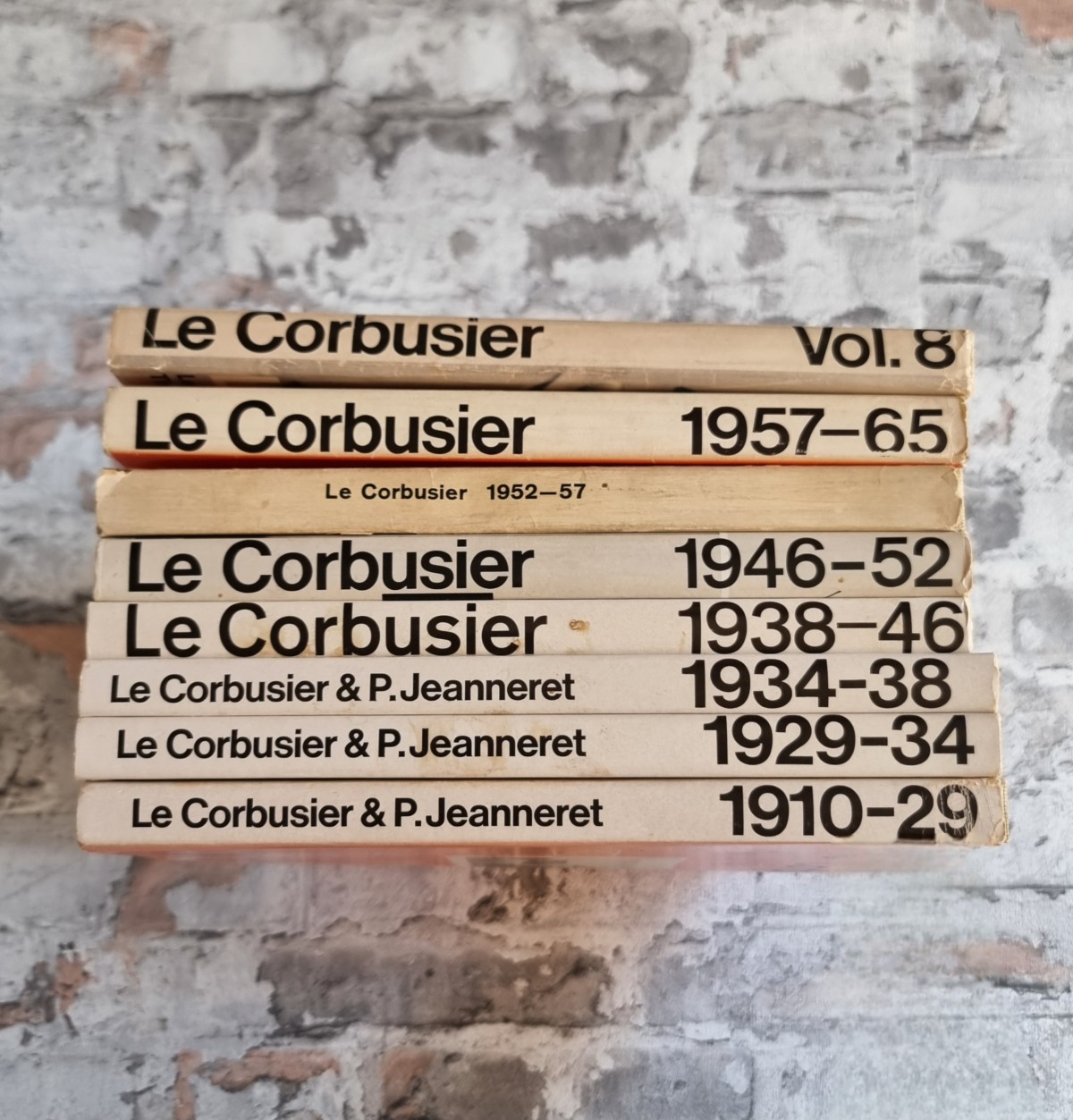 Kommentar/Zustand: Band 1: 1910-1929. 9. Auflage, 1967. 216 S. * Band 2: 1929-1934. 8. Auflage, 1967. 207 S. * 3. Band: 1934-1938. 8. Auflage, 1967. 175 S. * Band 4: 1938-1946. 5. Auflage, 1966. 208 S. * Band 5: 1946-1952. 5. Auflage, 1966. 244 S. * Band 6:1952-1957. 1. Auflage, 1957. 223 S. * Band 7: 1957-1965. 1. Auflage, 1965. 239 S. * Band 8: Les dernières OEvres – The Last Works – Die letzten Werke. 1. Auflage, 1970. 208 S. Dreisprachig. Französisch, Englisch, Deutsch. – Le Corbusier (1887–1965), einer der einflussreichsten Architekten und Theoretiker der Moderne, prägte mit seinen Entwürfen, Schriften und gebauten Werken maßgeblich das 20. Jahrhundert. Vom Pavillon de l’Esprit Nouveau über die Villen der 1920er Jahre, die Unité d’Habitation in Marseille, Chandigarh bis zu den späten Sakralbauten wie Ronchamp und La Tourette verband Le Corbusier radikale städtebauliche Visionen mit einer neuen Ästhetik des Wohnens und Bauens. Die von Willy Boesiger herausgegebene Reihe Œuvre complète ist das maßgebliche Werkverzeichnis Le Corbusiers. Es dokumentiert nicht nur alle Bauprojekte, Entwürfe, Möbel, Gemälde und Schriften, sondern reflektiert auch die Entwicklung der modernen Architektur in über fünf Jahrzehnten. Die großformatige, reich illustrierte Edition ist für Architekten, Kunsthistoriker und Sammler gleichermaßen ein unentbehrliches Referenzwerk – Schutzumschläge teilweise leicht beschädigt und etwas fleckig. Jeweils Besitzerstempel auf fliegendem Vorsatz und bei Band 6 und 7 zusätzlich handschriftlicher Besitzervermerk. Band 6 auf fliegendem Vorsatz Zeitungsausschnitt zum Tode von Le Corbusier eingeklebt. Sonst sehr gut erhaltene Exemplare der kompletten Ausgabe.