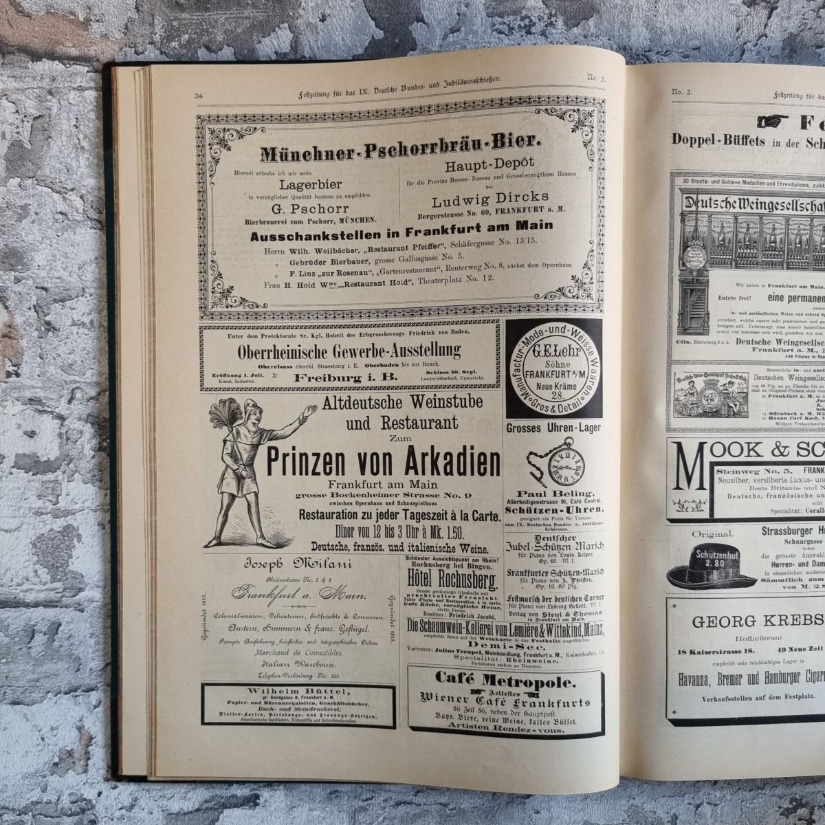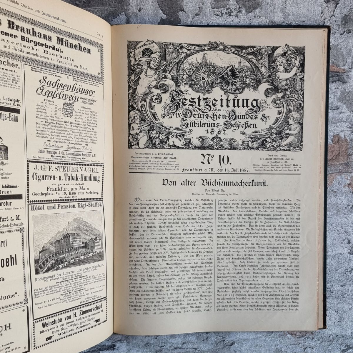 Kommentar/Zustand: Das 9. Deutsche Bundesschießen, 1887 in Frankfurt am Main, war eines der größten nationalen Volks- und Sportfeste des Kaiserreichs. Es vereinte Sportschützen, Veteranenvereine, patriotische Verbände und bürgerliche Gesellschaften aus allen Teilen des Deutschen Reiches und galt als Ausdruck nationaler Einheit, technischen Fortschritts und bürgerlichen Selbstbewusstseins. – Die „Festzeitung zum Deutschen Bundesschießen“, hier vollständig in 12 Nummern gebunden, dokumentiert das Ereignis in Wort und Bild: rBerichte über Eröffnungsfeier, Festzüge, Wettbewerbe und Preisverleihungen, reich illustrierte Darstellungen der Schießstände, Pavillons und Festarchitektur, Porträts bedeutender Teilnehmer und Ehrengäste, sowie lebendige Szenen aus dem gesellschaftlichen und gastronomischen Begleitprogramm. Hinzu kommen umfangreiche zeitgenössische Anzeigen und Reklamen (u. a. für Waffen, Optik, Brauereien, Hotels und technische Neuerungen), die dem Band hohen dokumentarischen Wert für die Alltags- und Wirtschaftsgeschichte des späten 19. Jahrhunderts verleihen. Ein prachtvolles, inhaltsreiches Zeitdokument eines nationalen Großereignisses, das zwischen Kaiserfest und Volksbelustigung stand und zugleich den frühen Schießsport als identitätsstiftendes Element des jungen Kaiserreichs zeigt. – Rücken und Lederecken etwas berieben. Insgesamt sehr gut erhaltenes Exemplar.