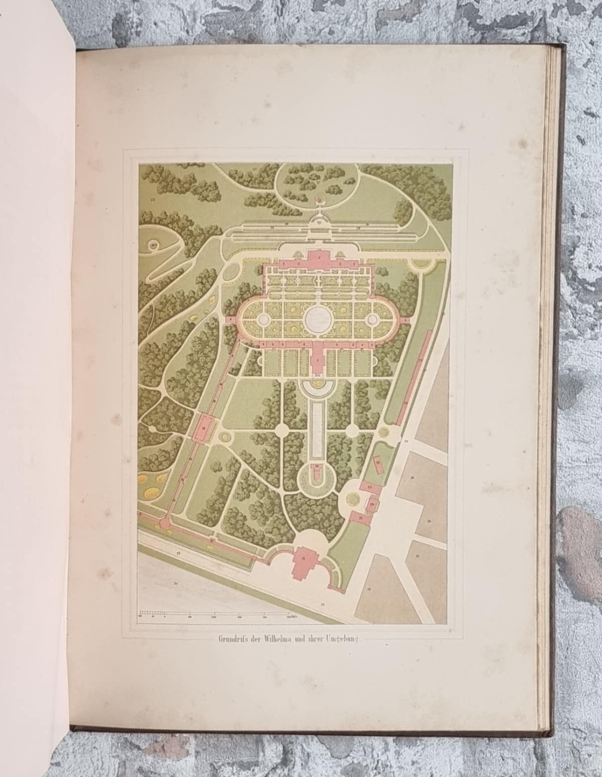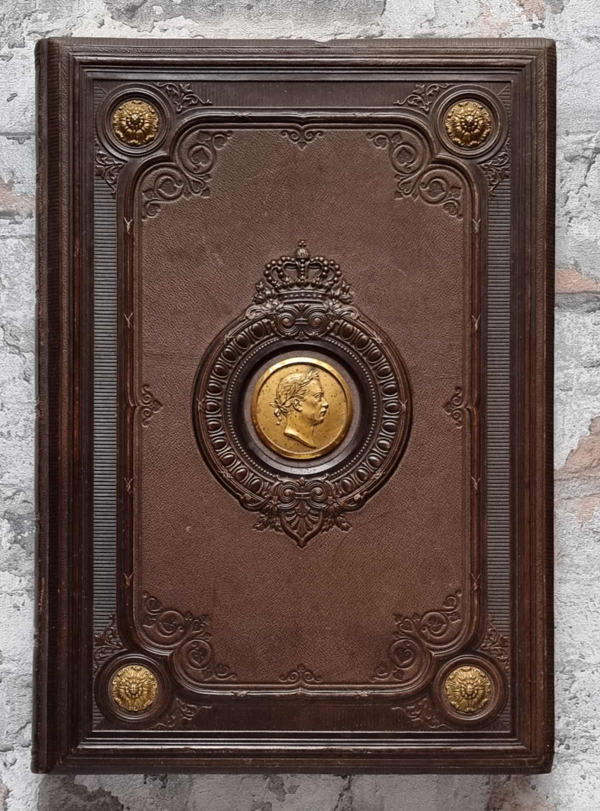 Stuttgart, Ebner & Seubert, 1865. 2° (43 x 30,5 cm). (2) leere Bl., (2) Bl. lithographierter Titel, 40 S., mit 12 Holzschnitt-Textillustrationen (1 farbig), 13 Bl. farblithographierte Tafeln jeweils mit Seidenpapier geschützt. Dreiseitiger Goldschnitt. Originales, blindgeprägtes Kalbsleder mit 8 aufmontierten erhabenen Messingrosetten (Durchmesser ca. 25 mm, Höhe ca. 5 mm), einem zentralen Porträtmedaillon (Durchmesser ca. 60 mm) mit dem Portrait Wilhelms von Württemberg auf dem Vorderdeckel und blindgeprägtem Wappen von Württemberg auf dem Hinterdeckel.