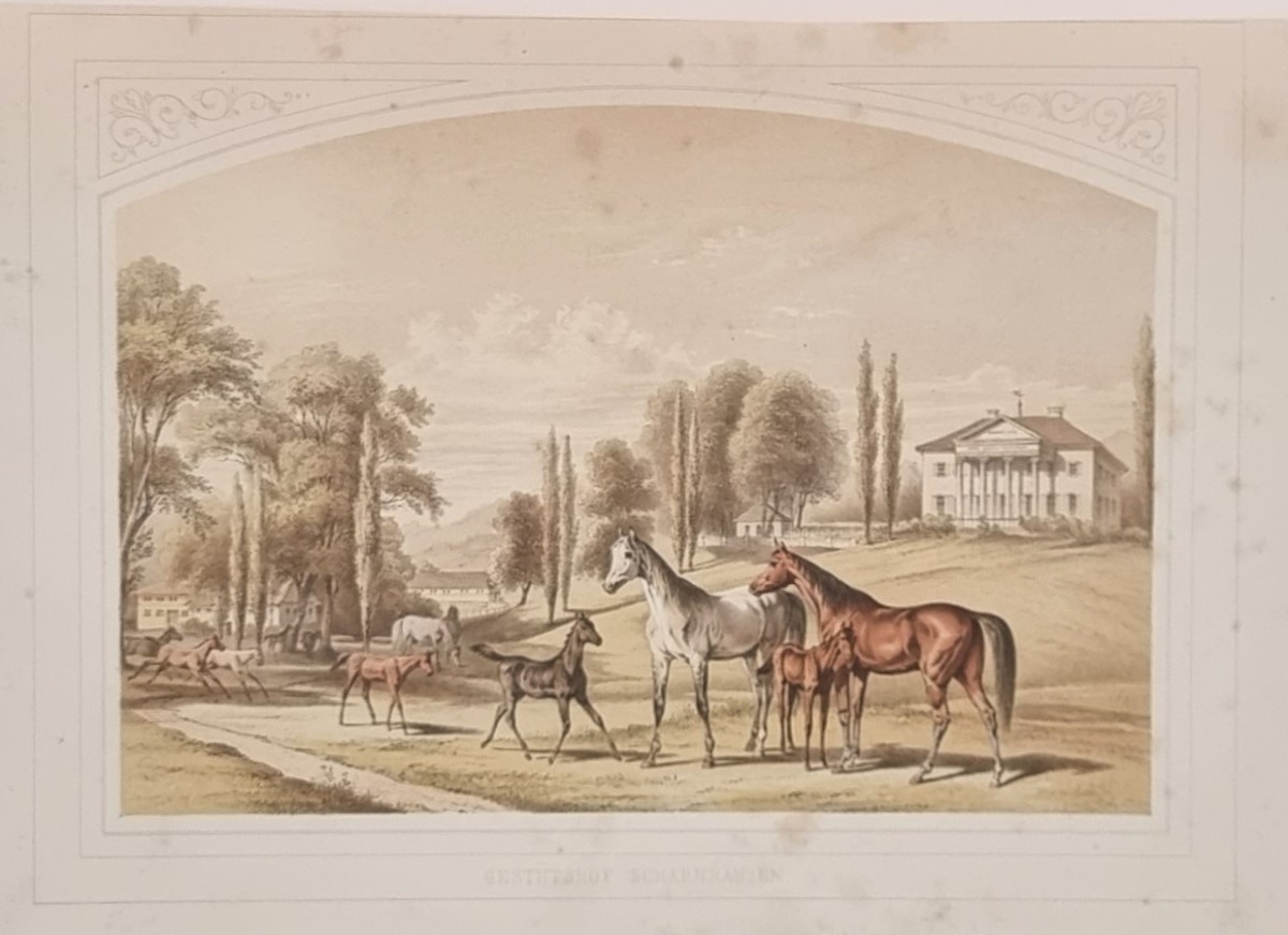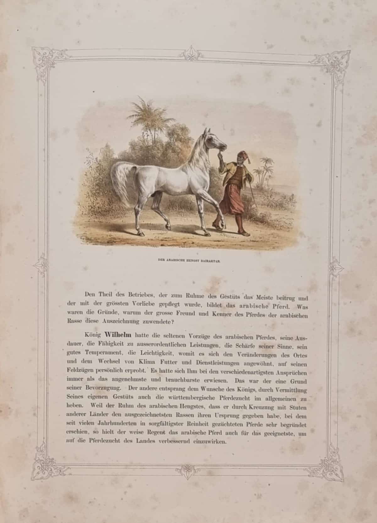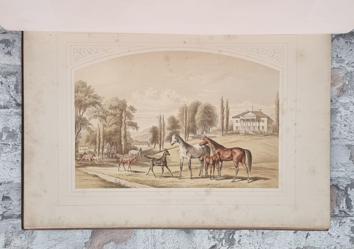 Kommentar/Zustand: Heyd 2773. – Mit handschriftlicher Widmung des Verlegers Albert Ebner (1837-1871) an den Illustrator Julius Schnorr (1794–1872) signiert und datiert (Stuttg. 5. Octbr. 1865). – Die ganzseitigen Tafeln zeigen Abbildungen der berühmten Gestüte des Königs. Die königlich württembergischen Gestüte wurden von 1852 bis 1871 von Baron Julius von Hügel (1810-1884) geleitet. – Durchgehend etwas stockfleckig.