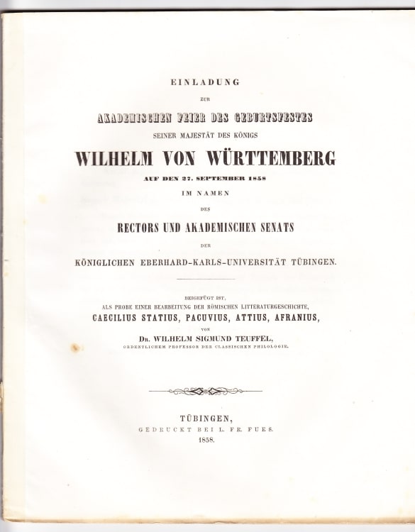 Teuffel, Wilhelm Sigmund. Einladung zur akademischen Feier des Geburtsfestes seiner Majestät des Königs Karl von Württemberg auf den 27. September 1858, im Namen des Rectors und akademischen Senats der Königlichen Eberhard-Karls-Universität Tübingen. Beigefügt ist, als Probe einer Bearbeitung der römischen Literaturgeschichte, Caecilius Statius, Pacuvius, Attius, Afranius.