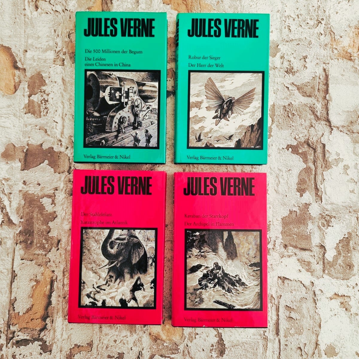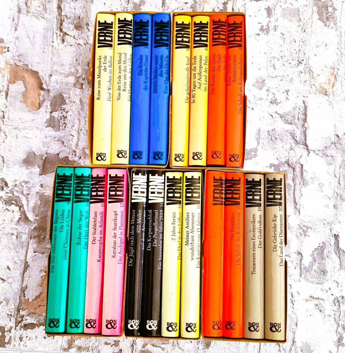 Kommentar/Zustand: Die Bärmeie & Nickel Originalausgabe, nicht die Lizenzausgabe von Löwit( von ca. 1980)! – Enthält: Band 1. Reise zum Mittelpunkt der Erde. / Fünf Wochen im Ballon. – Band 2. Von der Erde zum Mond. / Reise um den Mond. / Ein Drama in den Lüften. – Band 3. Die Kinder des Kapitän Grant. – Band 4. 20000 Meilen unter dem Meer. / Eine Idee des Dr. Ox. – Band 5. Die geheimnisvolle Insel. – Band 6. In 80 Tagen um die Welt. / Auf Außenposten im Land der Pelze. – Band 7. Der Kurier des Zaren. / Die Stadt unter der Erde. – Band 8. Reise durch das Sonnensystem. / Der Schuß am Kilimandscharo. – Band 9. Die 500 Millionen der Begum. / Die Leiden eines Chinesen in China. – Band 10. Robur der Sieger. / Der Herr der Welt. / Meister Zacharius. – Band 11. Der Stahlelefant. / Katastrophe im Atlantik. – Band 12. Keraban der Starrkopf. / Der Archipel in Flammen. – Band 13. Die Jagd nach dem Meteor. / 800 Meilen auf dem Amazonas. – Band 14. Das Karpatenschloß. / Die Propellerinsel. / Ein Journalist im Jahre 2889. – Band 15. Zwei Jahre Ferien. / Das Dorf in den Lüften. – Band 16. Meister Antifers wunderbare Abenteuer. / Ein Kapitän von 15 Jahren. – Band 17. Mathias Sandorf. – Band 18. Die Eissphinx. / Die Schule der Robinsons. – Band 19. Der Goldvulkan. / Testament eines Exzentrikers. – Band 20. Die Gebrüder Kip. / Das Land der Diamanten. – Durchgehend nahezu neuwertige Exemplare. Nur die Rücken der Schutzumschläge sind bei einigen Bänden etwas lichtgebleicht. – Versandkosten außerhalb Deutschlands aufgrund des hohen Gewichts auf Anfrage.